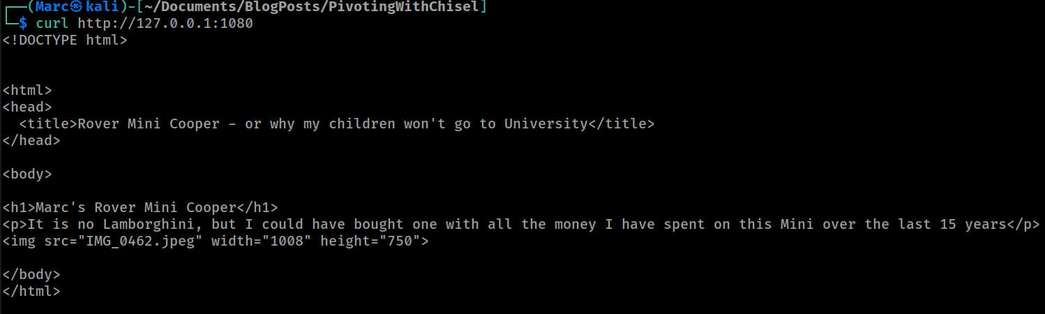 Now we are all setup we can attempt to use our port forward. The simplest way to test our port forward to the Web Server is simply to Curl it: